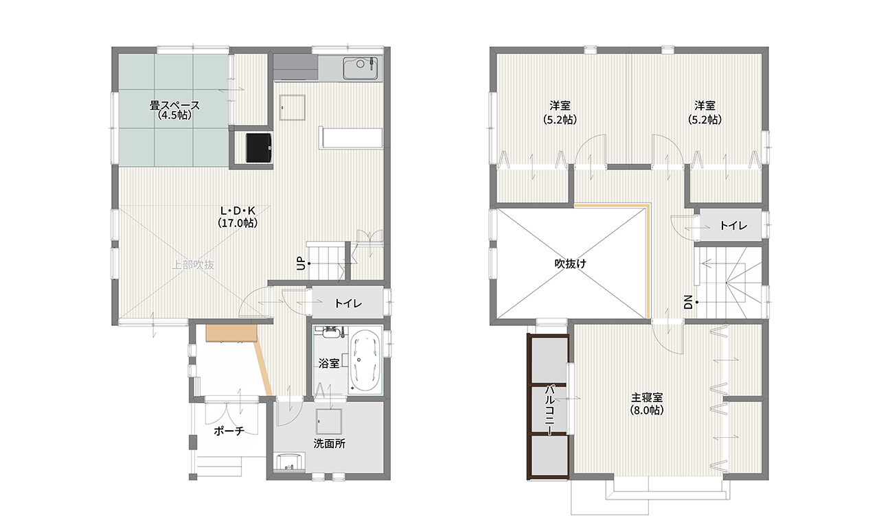 | 間取り/詳細 | 4LDK/ LDK 17.0帖/和室 4.5帖/洋室 5.2帖/洋室 5.2帖/洋室 8.0帖 床暖房/吹抜け/各部屋収納あり/可動式間仕切りあり(2階)/ |